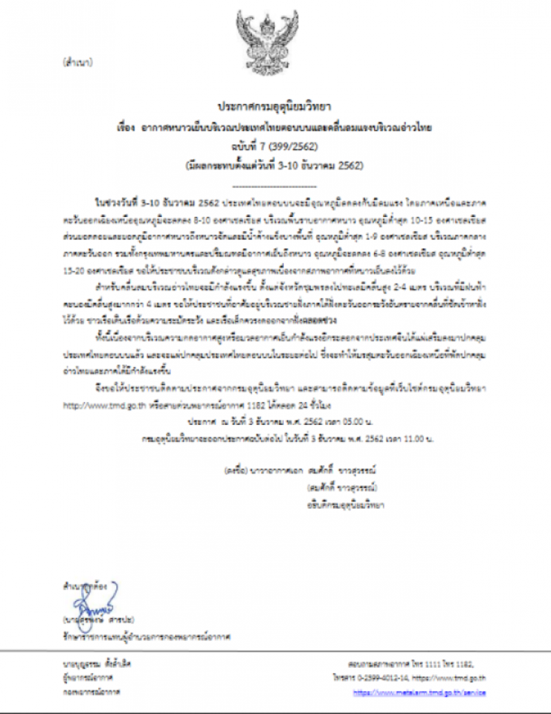 กรมอุตุนิยมวิทยา ประกาศฉบับที่ 7 ลงวันที่ 3 ธันวาคม 62 ในช่วงวันที่ 3 ถึง 10 ธันวาคม 2562 ประเทศไทยตอนบนจะมีอุณหภูมิลดลงกับมีลมแรง โดยภาคเหนือและภาคตะวันออกเฉียงเหนืออุณหภูมิจะลดลง 8 ถึง 10 องศาเซลเซียส บริเวณพื้นราบอากาศหนาว อุณหภูมิต่ำสุด 10 ถึง 15 องศาเซลเซียส